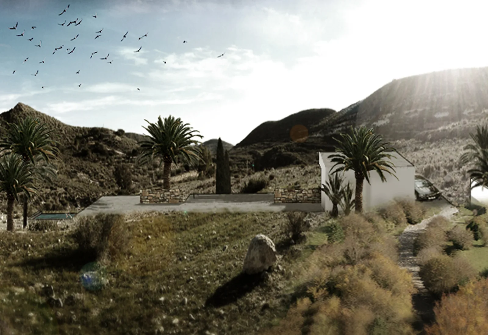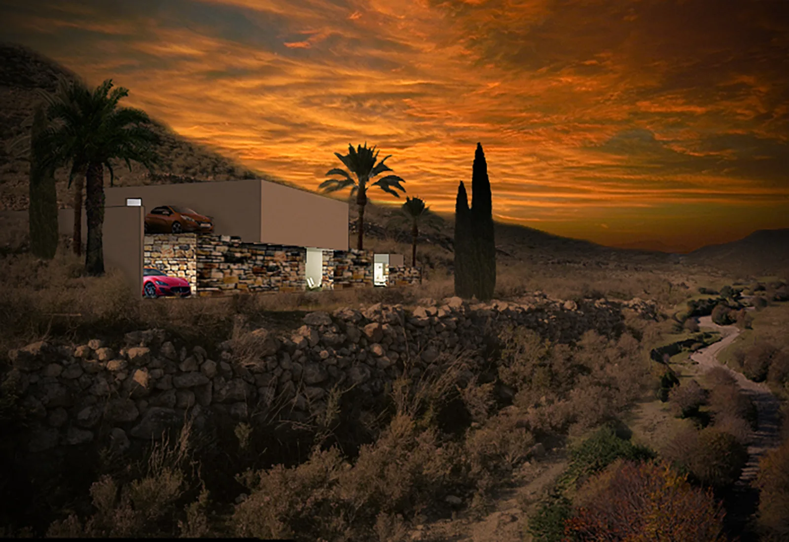 Aprovechando la topografía del terreno, con sus actuales bancales y balates, se propone insertar la pieza en el terreno para conseguir una mejor integración paisajística. De este modo, la planta baja se convierte en planta semisótano y se encuentra prácticamente integrada en el terreno. El muro exterior de esta planta se entiende como una continuidad del balate, con el mismo tratamiento petreo, elevando tan solo un pequeño volumen blanco sobre él. Esta integración permite hacer casi inapreciable el volumen de la edificación desde el exterior.