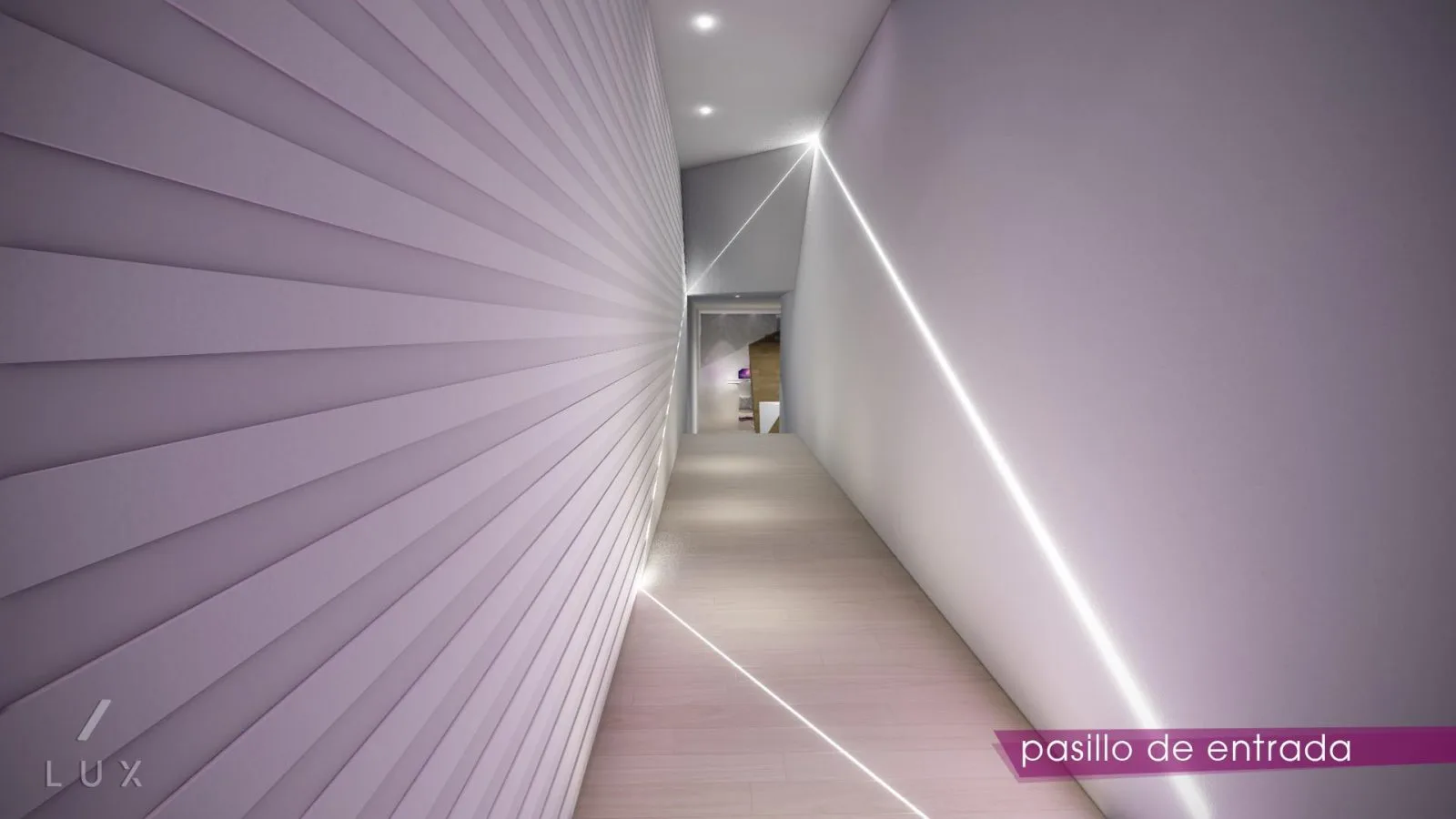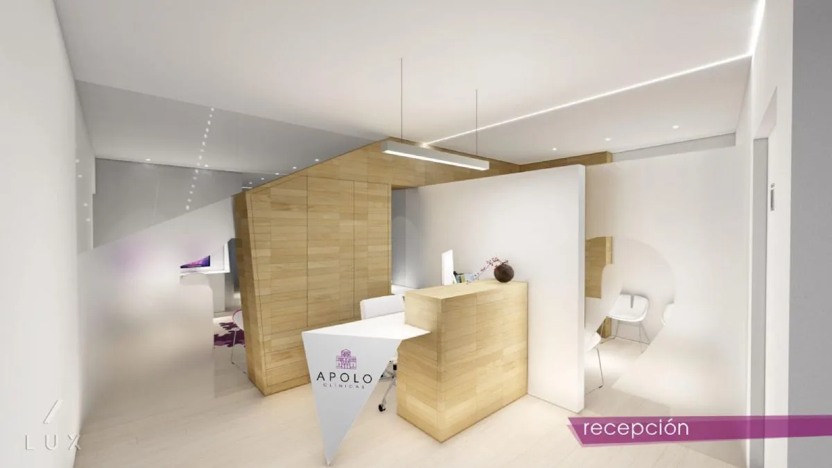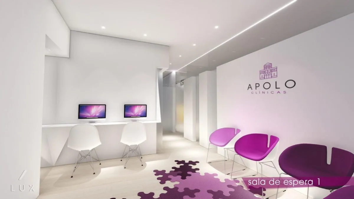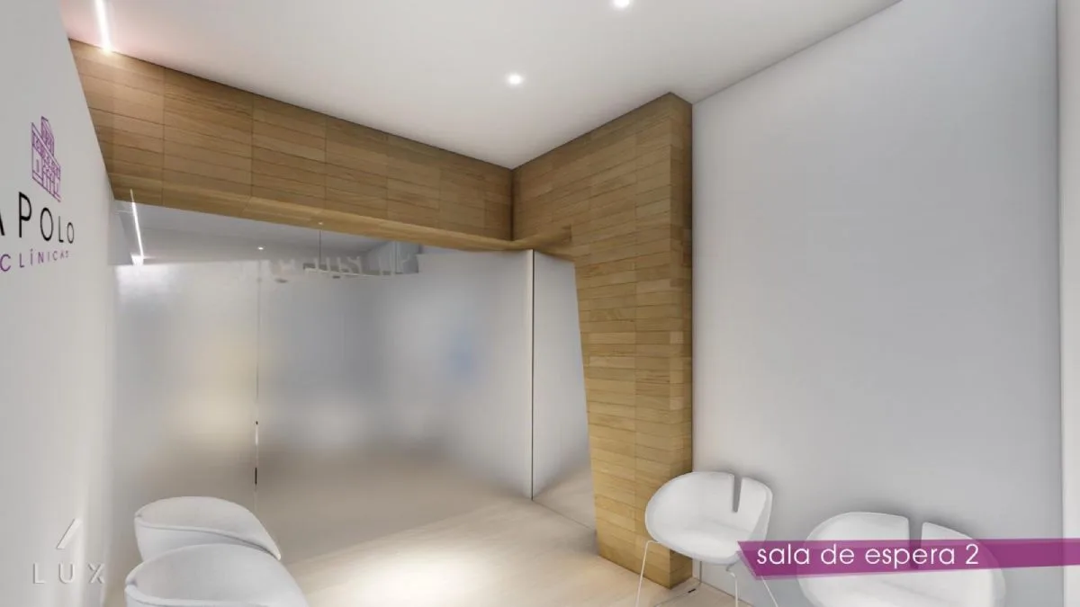 Las salas de espera, se diferencian en sus tonalidades, colores fucsias y morados para la zona de estética, y la madera y el blanco en la sala de médico perito. Espejos en ciertas superficies amplifican estos espacios y se ameniza la espera con ordenadores disponibles para los pacientes.