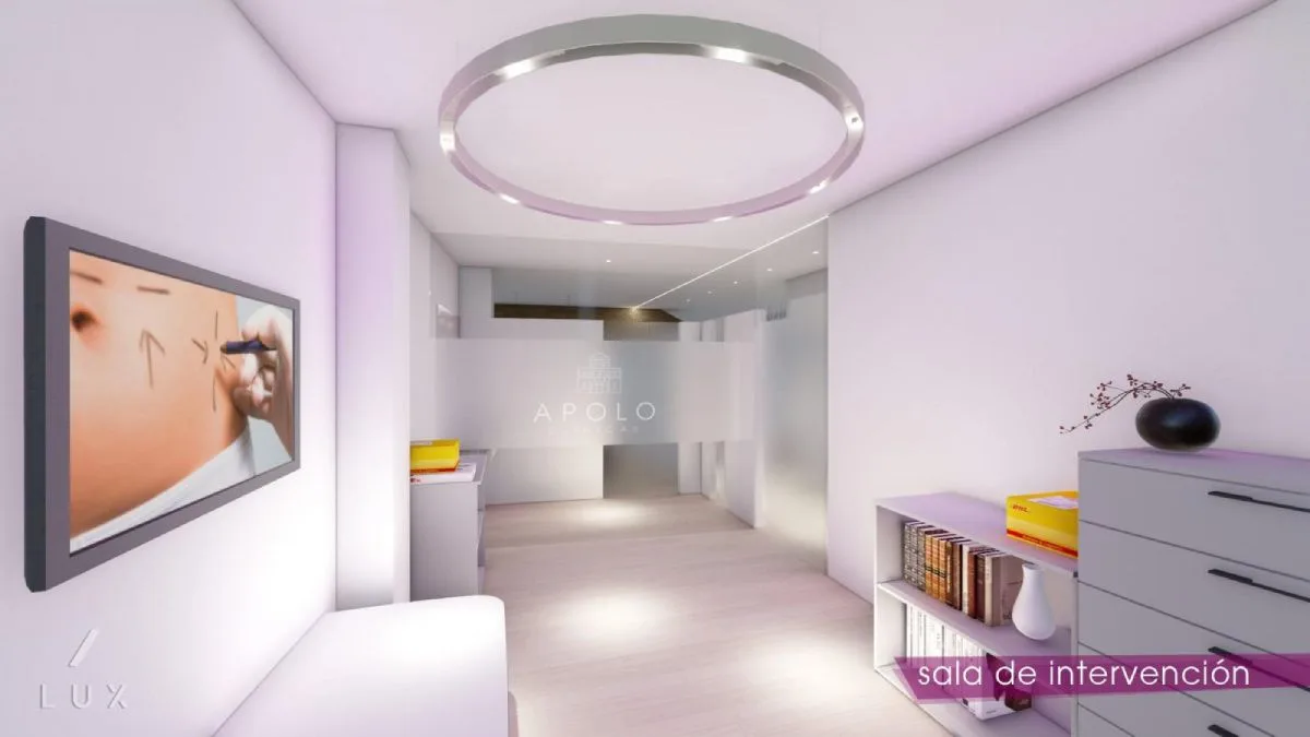 Local comercial con unas dimensiones, a priori, poco generosas para la actividad especificada. Un local longitudinal, con entrada de luz y ventilación en uno de sus extremos, y acceso a través de un largo pasillo en desnivel con el resto del local. El cliente, requiere la compatibilidad de dos usos distintos autónomos (clinica estética y médico perito), con servicios comunes como recepción y aseos.