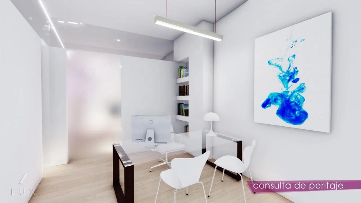 La propuesta de interiorismo responde a estas premisas con distintas intervenciones. Un recibidor común para ambas consultas, que da acceso a distintas salas de espera según el cliente. Para versatilizar el espacio, los cerramientos no alcanzan el techo para no reducir la sensación espacial, y potenciar la zona común de ambas salas de espera. El mueble justo detrás de recepción, servirá para acopiar toda la documentación de pacientes y clientes, y tendrá continuidad por ambas salas de espera.