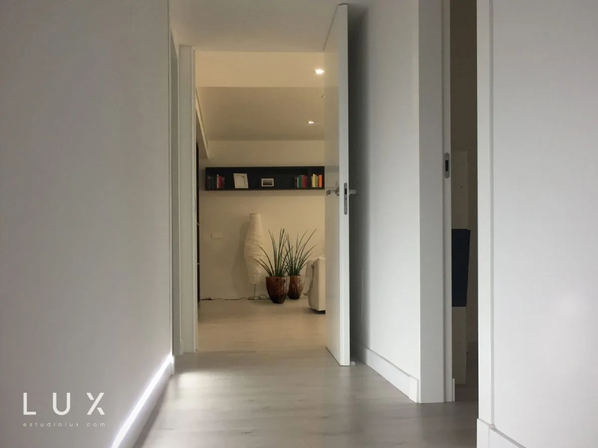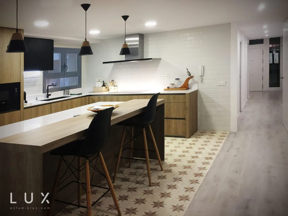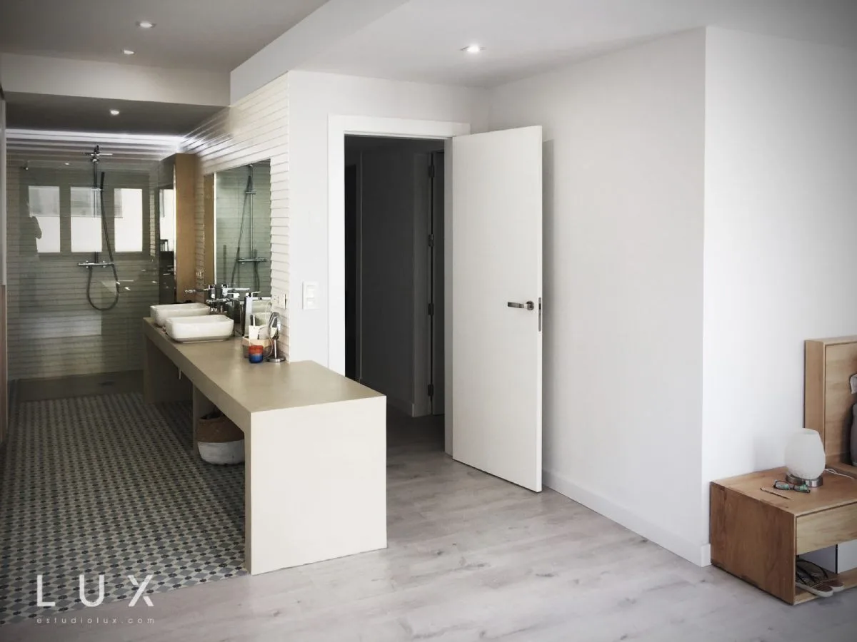 Dada la orientación nordeste de la vivienda, se ha optado por la claridad de los materiales y espacios diáfanos que permitan el paso de la luz. Se han empleado microcemento de distintas tonalidades en encimeras, suelos, revestimientos de pilares, ducha y bañera, etc. eliminando así las juntas. En los cuartos húmedos se ha colocado solería hidráulica de distintas formas y colores, y en el resto de la casa se ha optado por una tarima flotante de tonalidad clara. Por otra parte, un sistema de iluminación LED con sensores de movimiento permite la iluminación de los recorridos de paso más oscuros para mayor confort del cliente.