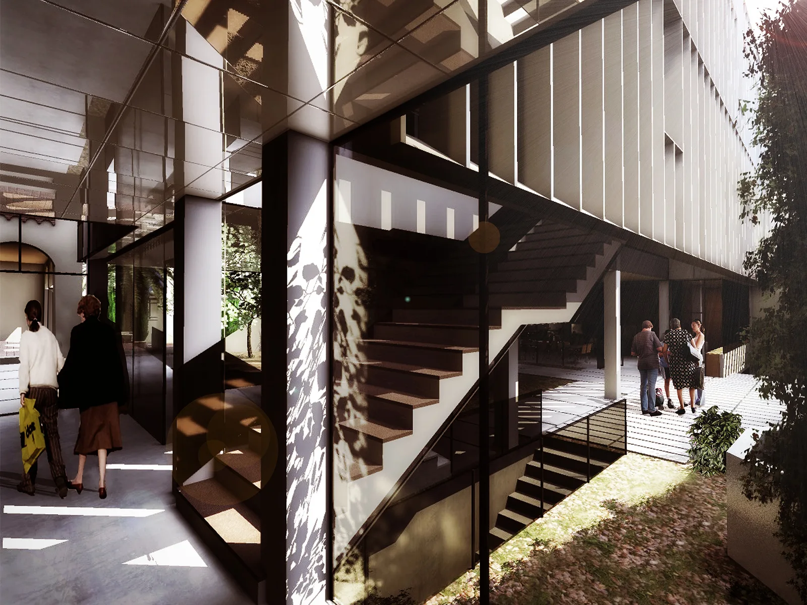 En su fachada norte se encuentra un gran jardín, donde el nuevo edificio presenta una superficie acristalada que actúa como reflejo de su entorno natural, y unas persianas de malla metálica correderas que protegen de los últimos rayos solares de la tarde.
